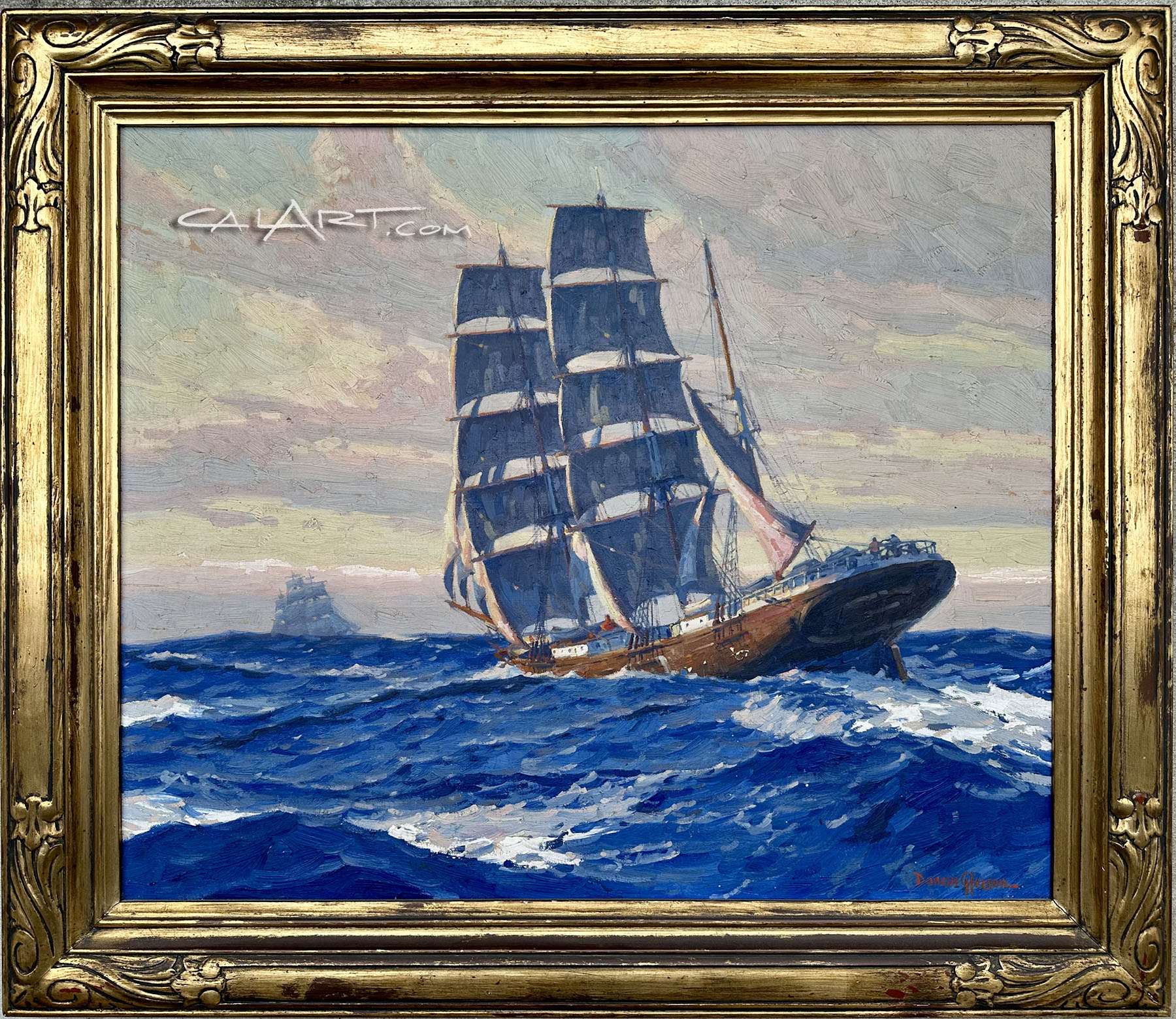Joe Gleason was a native of California, born in Watsonville, in 1881. He was known for his landscape and marine paintings of San Pedro Harbor on the California coast. He also wrote and illustrated several books on California maritime history and worked for the scenic art department at Metro Goldwyn Mayer and Warner Brothers studios.